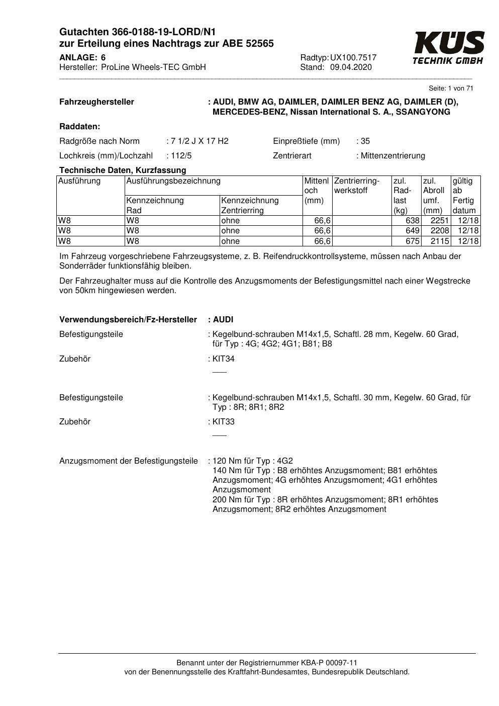 Dieses Gutachten (ABE) bezieht sich auf die Alufelge Proline UX100.7517 in der Ausführung 7.5Jx17 ET 0, Mittenloch 0 mm (KBA 52565). Im PDF findest du typischerweise zulässige Reifengrößen, Auflagen/Anbauhinweise und – je nach Dokument – Hinweise zur Eintragung.