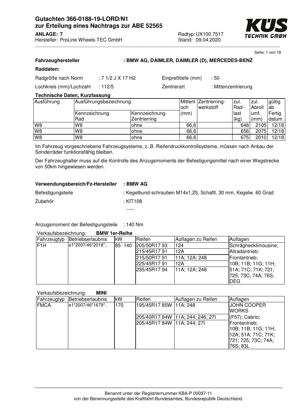 Dieses Gutachten (ABE) bezieht sich auf die Alufelge Proline UX100.7517 in der Ausführung 7.5Jx17 ET 0, Mittenloch 0 mm (KBA 52565). Im PDF findest du typischerweise zulässige Reifengrößen, Auflagen/Anbauhinweise und – je nach Dokument – Hinweise zur Eintragung.