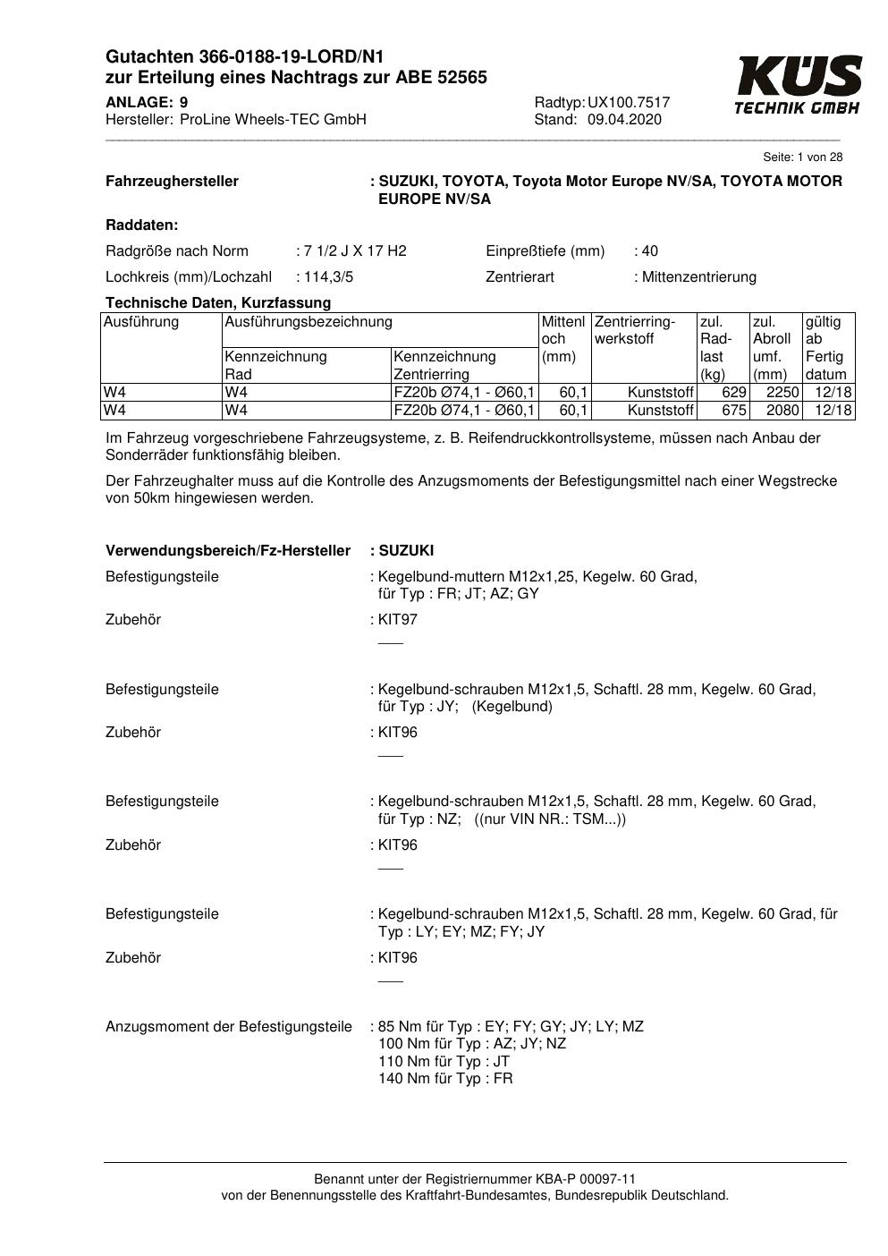 Dieses Gutachten (ABE) bezieht sich auf die Alufelge Proline UX100.7517 in der Ausführung 7.5Jx17 ET 0, Mittenloch 0 mm (KBA 52565). Im PDF findest du typischerweise zulässige Reifengrößen, Auflagen/Anbauhinweise und – je nach Dokument – Hinweise zur Eintragung.