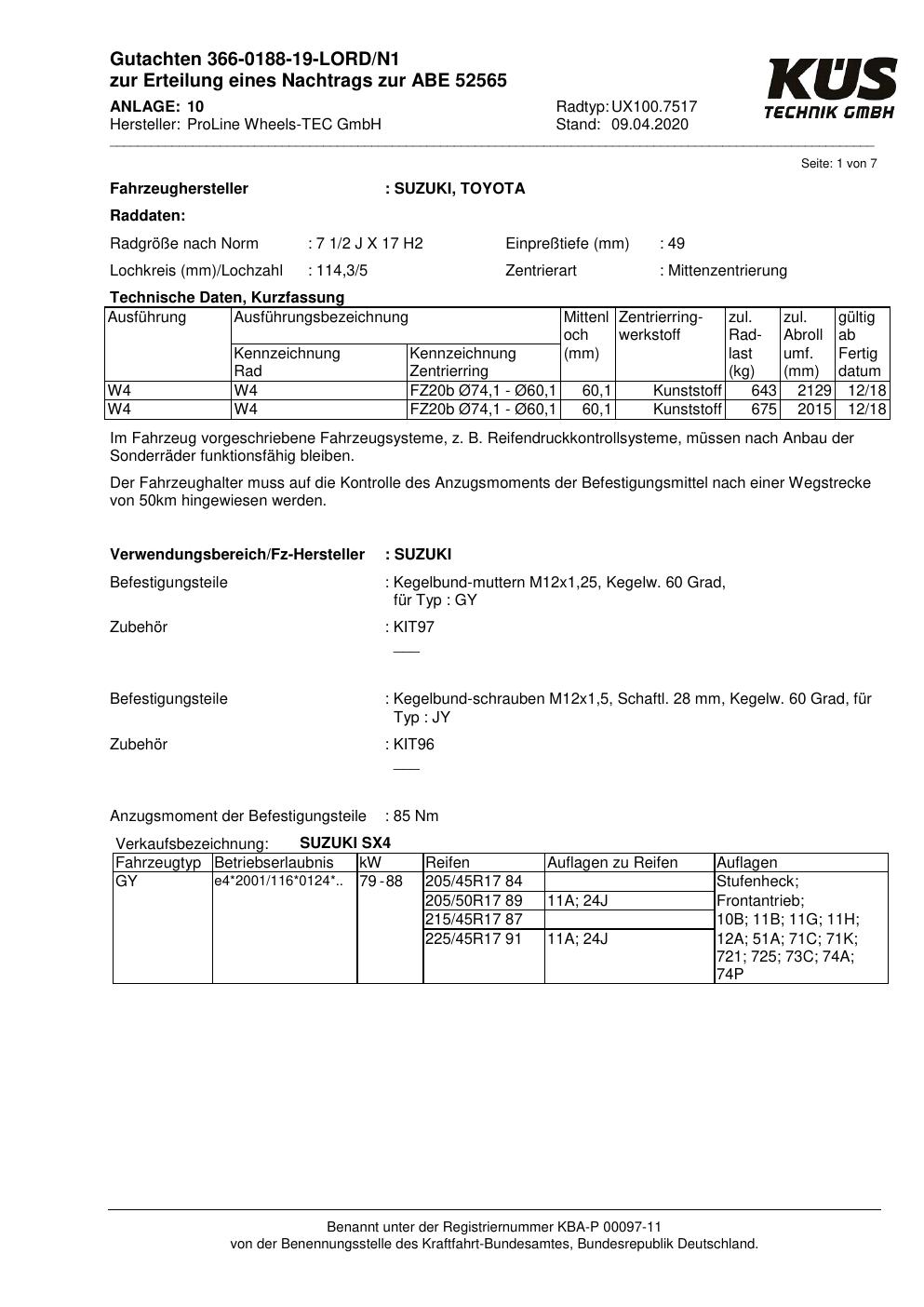 Dieses Gutachten (ABE) bezieht sich auf die Alufelge Proline UX100.7517 in der Ausführung 7.5Jx17 ET 0, Mittenloch 0 mm (KBA 52565). Im PDF findest du typischerweise zulässige Reifengrößen, Auflagen/Anbauhinweise und – je nach Dokument – Hinweise zur Eintragung.