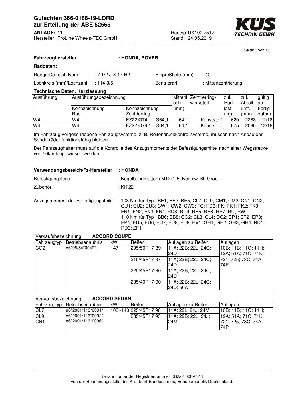 Dieses Gutachten (ABE) bezieht sich auf die Alufelge Proline UX100.7517 in der Ausführung 7.5Jx17 ET 0, Mittenloch 0 mm (KBA 52565). Im PDF findest du typischerweise zulässige Reifengrößen, Auflagen/Anbauhinweise und – je nach Dokument – Hinweise zur Eintragung.