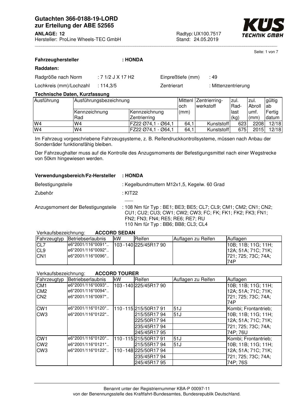 Dieses Gutachten (ABE) bezieht sich auf die Alufelge Proline UX100.7517 in der Ausführung 7.5Jx17 ET 0, Mittenloch 0 mm (KBA 52565). Im PDF findest du typischerweise zulässige Reifengrößen, Auflagen/Anbauhinweise und – je nach Dokument – Hinweise zur Eintragung.