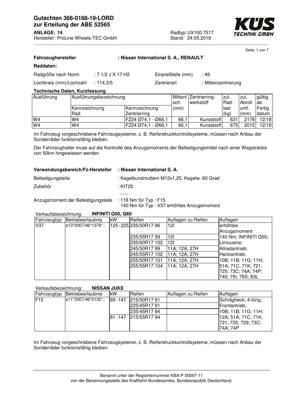 Dieses Gutachten (ABE) bezieht sich auf die Alufelge Proline UX100.7517 in der Ausführung 7.5Jx17 ET 0, Mittenloch 0 mm (KBA 52565). Im PDF findest du typischerweise zulässige Reifengrößen, Auflagen/Anbauhinweise und – je nach Dokument – Hinweise zur Eintragung.