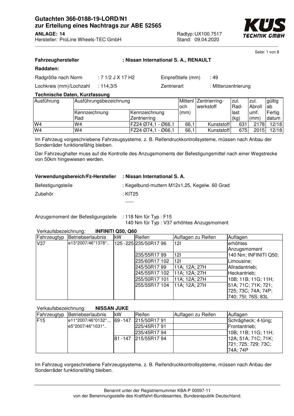 Dieses Gutachten (ABE) bezieht sich auf die Alufelge Proline UX100.7517 in der Ausführung 7.5Jx17 ET 0, Mittenloch 0 mm (KBA 52565). Im PDF findest du typischerweise zulässige Reifengrößen, Auflagen/Anbauhinweise und – je nach Dokument – Hinweise zur Eintragung.