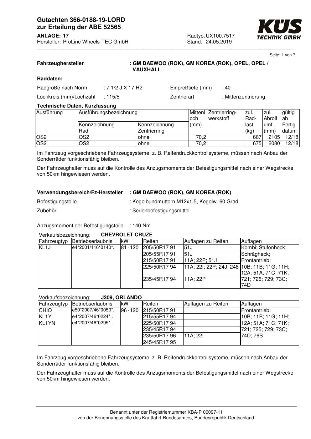 Dieses Gutachten (ABE) bezieht sich auf die Alufelge Proline UX100.7517 in der Ausführung 7.5Jx17 ET 0, Mittenloch 0 mm (KBA 52565). Im PDF findest du typischerweise zulässige Reifengrößen, Auflagen/Anbauhinweise und – je nach Dokument – Hinweise zur Eintragung.