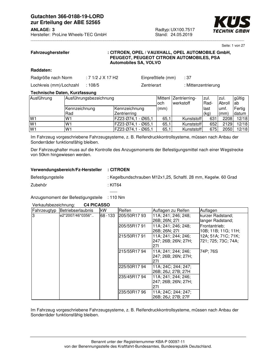 Dieses Gutachten (ABE) bezieht sich auf die Alufelge Proline UX100.7517 in der Ausführung 7.5Jx17 ET 0, Mittenloch 0 mm (KBA 52565). Im PDF findest du typischerweise zulässige Reifengrößen, Auflagen/Anbauhinweise und – je nach Dokument – Hinweise zur Eintragung.