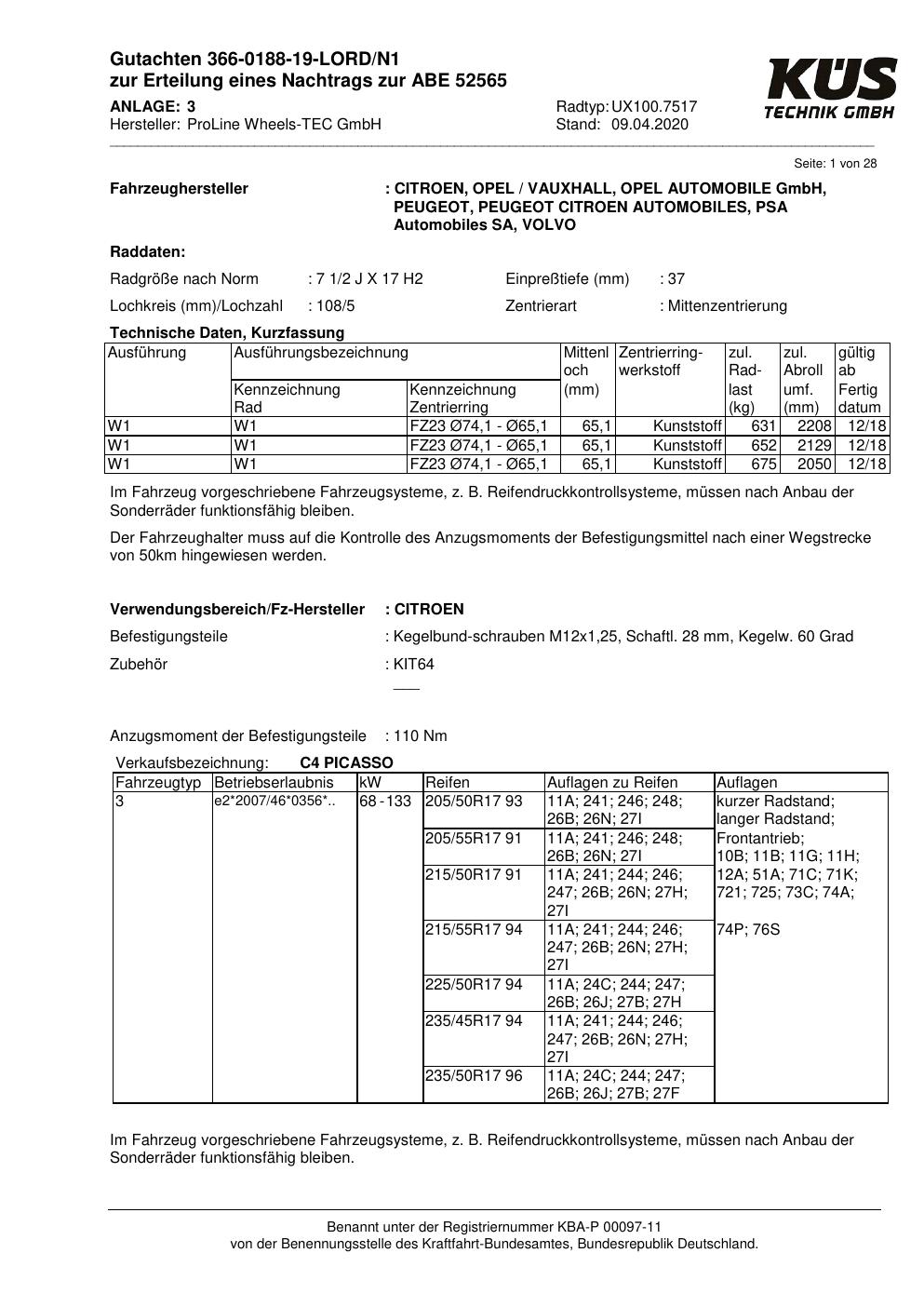 Dieses Gutachten (ABE) bezieht sich auf die Alufelge Proline UX100.7517 in der Ausführung 7.5Jx17 ET 0, Mittenloch 0 mm (KBA 52565). Im PDF findest du typischerweise zulässige Reifengrößen, Auflagen/Anbauhinweise und – je nach Dokument – Hinweise zur Eintragung.