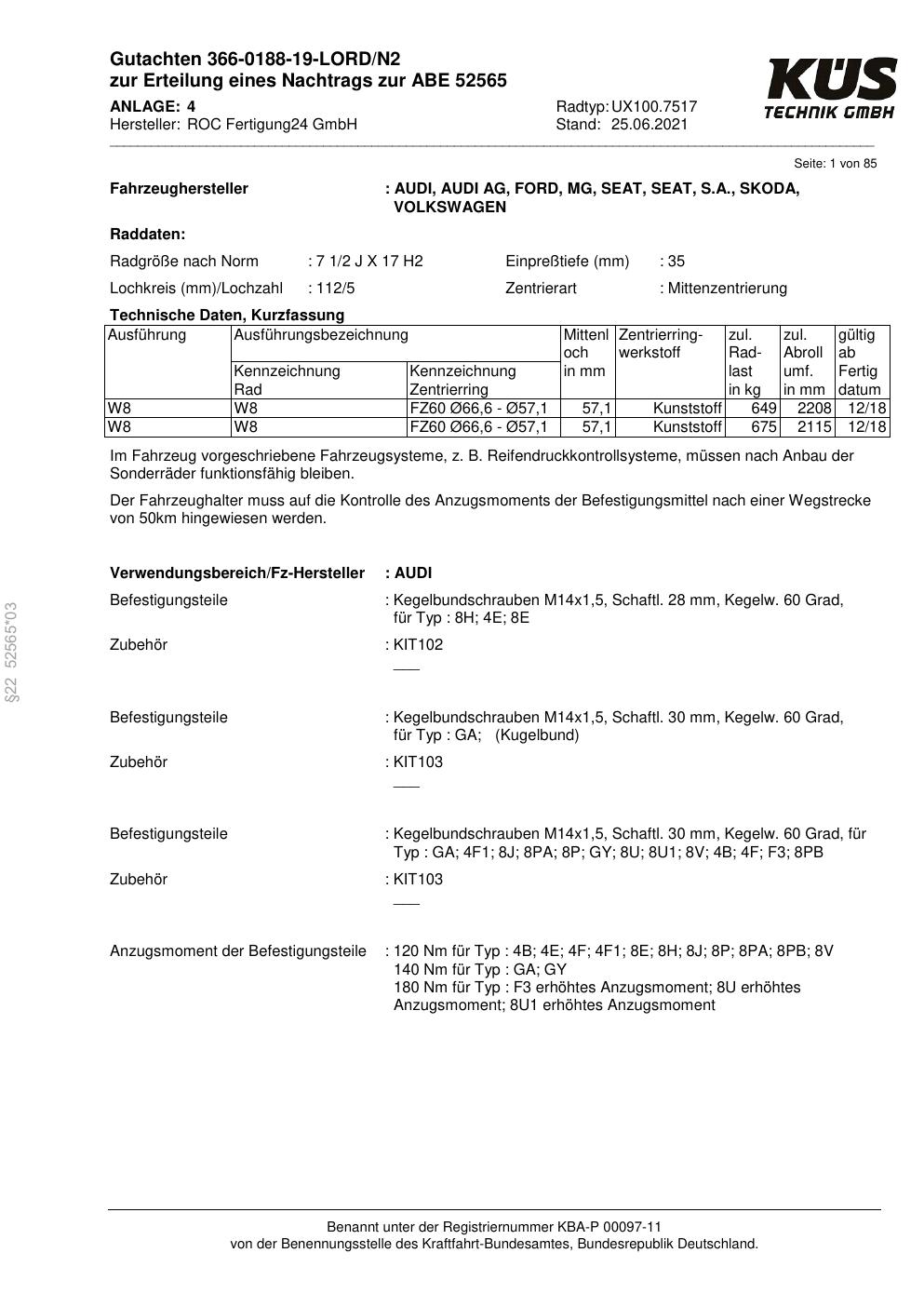 Felgengutachten / ABE für Alufelgen Proline UX100.7517 (7.5Jx17 ET 0, Mittenloch 0 mm) mit KBA 52565 (Zertifikatsnummer KBA 52565). Hier kostenlos als PDF herunterladen. Der Download-Link ist 24 Stunden gültig und kann bis zu zwei Mal verwendet werden.