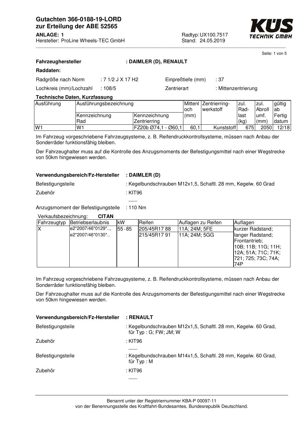 Dieses Gutachten (ABE) bezieht sich auf die Alufelge Proline UX100.7517 in der Ausführung 7.5Jx17 ET 0, Mittenloch 0 mm (KBA 52565). Im PDF findest du typischerweise zulässige Reifengrößen, Auflagen/Anbauhinweise und – je nach Dokument – Hinweise zur Eintragung.