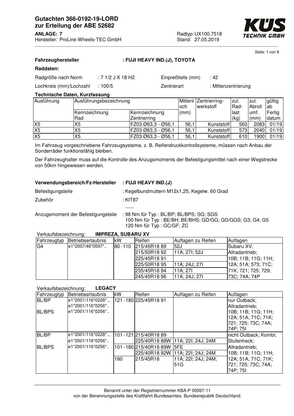 Felgengutachten / ABE für Alufelgen Proline UX100.7518 (7.5Jx18 ET 0, Mittenloch 0 mm) mit KBA 52682 (Zertifikatsnummer KBA 52682). Hier kostenlos als PDF herunterladen. Der Download-Link ist 24 Stunden gültig und kann bis zu zwei Mal verwendet werden.