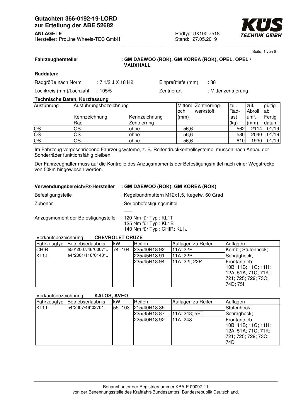 Felgengutachten / ABE für Alufelgen Proline UX100.7518 (7.5Jx18 ET 0, Mittenloch 0 mm) mit KBA 52682 (Zertifikatsnummer KBA 52682). Hier kostenlos als PDF herunterladen. Der Download-Link ist 24 Stunden gültig und kann bis zu zwei Mal verwendet werden.