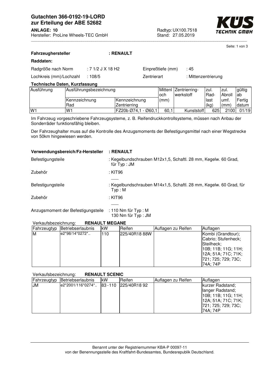 Felgengutachten / ABE für Alufelgen Proline UX100.7518 (7.5Jx18 ET 0, Mittenloch 0 mm) mit KBA 52682 (Zertifikatsnummer KBA 52682). Hier kostenlos als PDF herunterladen. Der Download-Link ist 24 Stunden gültig und kann bis zu zwei Mal verwendet werden.