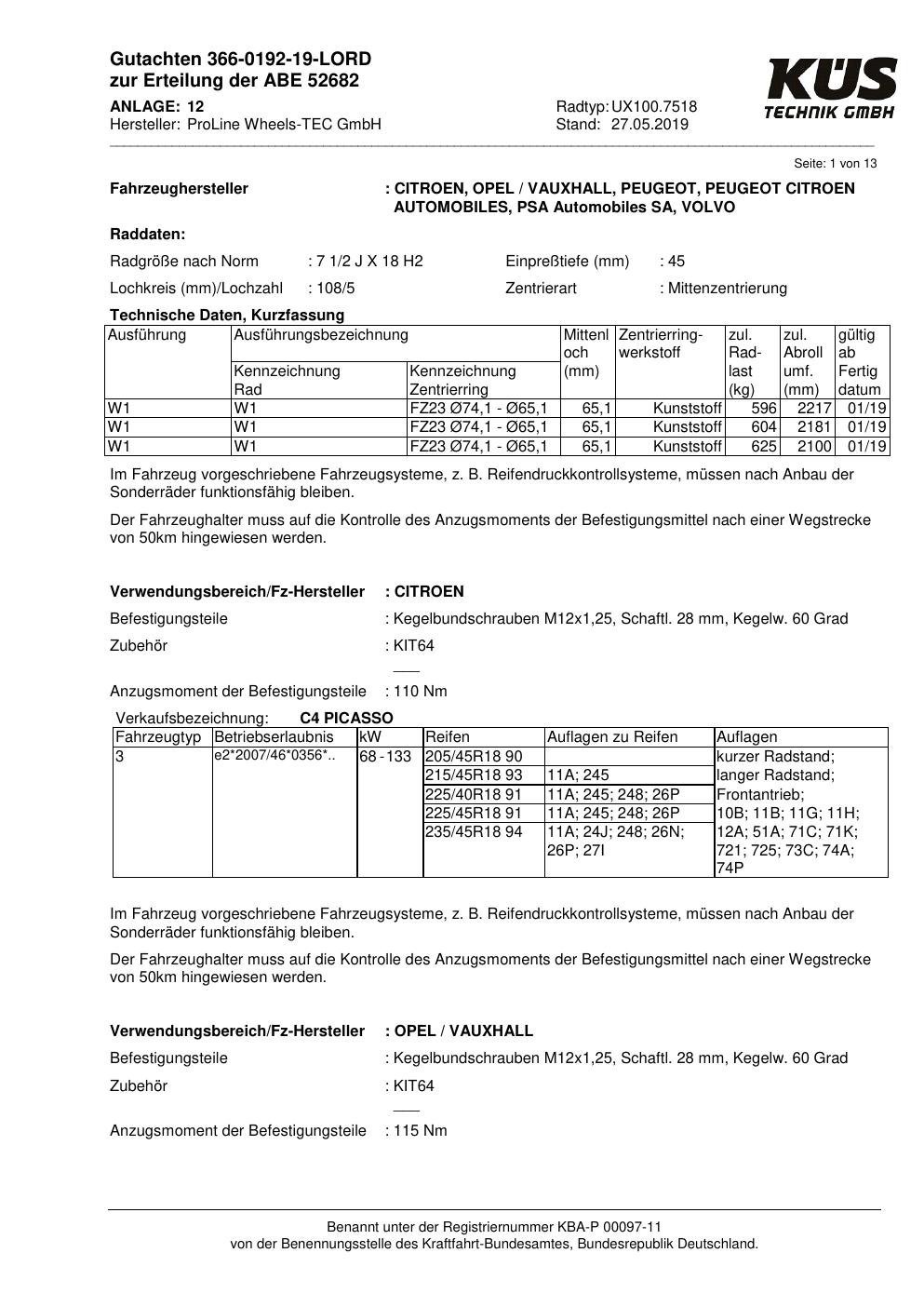 Dieses Gutachten (ABE) bezieht sich auf die Alufelge Proline UX100.7518 in der Ausführung 7.5Jx18 ET 0, Mittenloch 0 mm (KBA 52682). Im PDF findest du typischerweise zulässige Reifengrößen, Auflagen/Anbauhinweise und – je nach Dokument – Hinweise zur Eintragung.