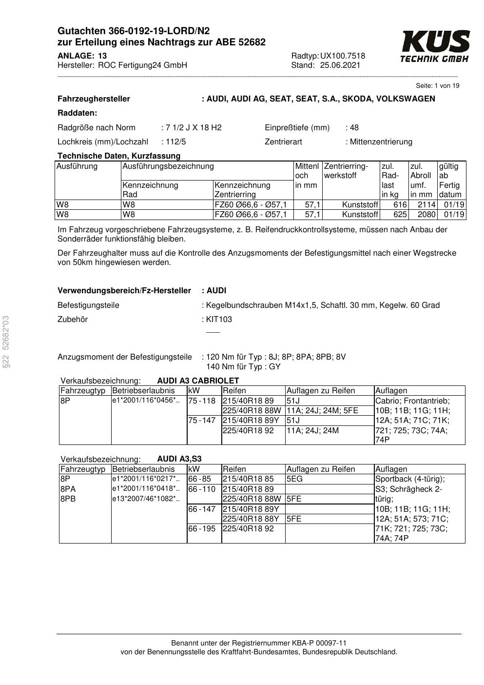 Dieses Gutachten (ABE) bezieht sich auf die Alufelge Proline UX100.7518 in der Ausführung 7.5Jx18 ET 0, Mittenloch 0 mm (KBA 52682). Im PDF findest du typischerweise zulässige Reifengrößen, Auflagen/Anbauhinweise und – je nach Dokument – Hinweise zur Eintragung.