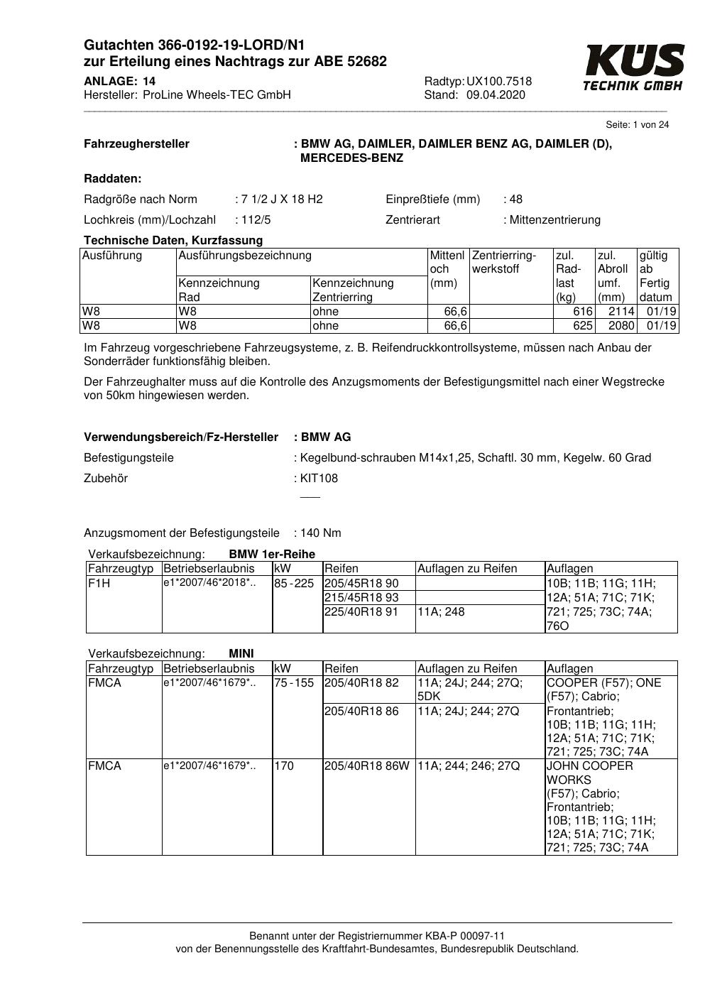 Dieses Gutachten (ABE) bezieht sich auf die Alufelge Proline UX100.7518 in der Ausführung 7.5Jx18 ET 0, Mittenloch 0 mm (KBA 52682). Im PDF findest du typischerweise zulässige Reifengrößen, Auflagen/Anbauhinweise und – je nach Dokument – Hinweise zur Eintragung.