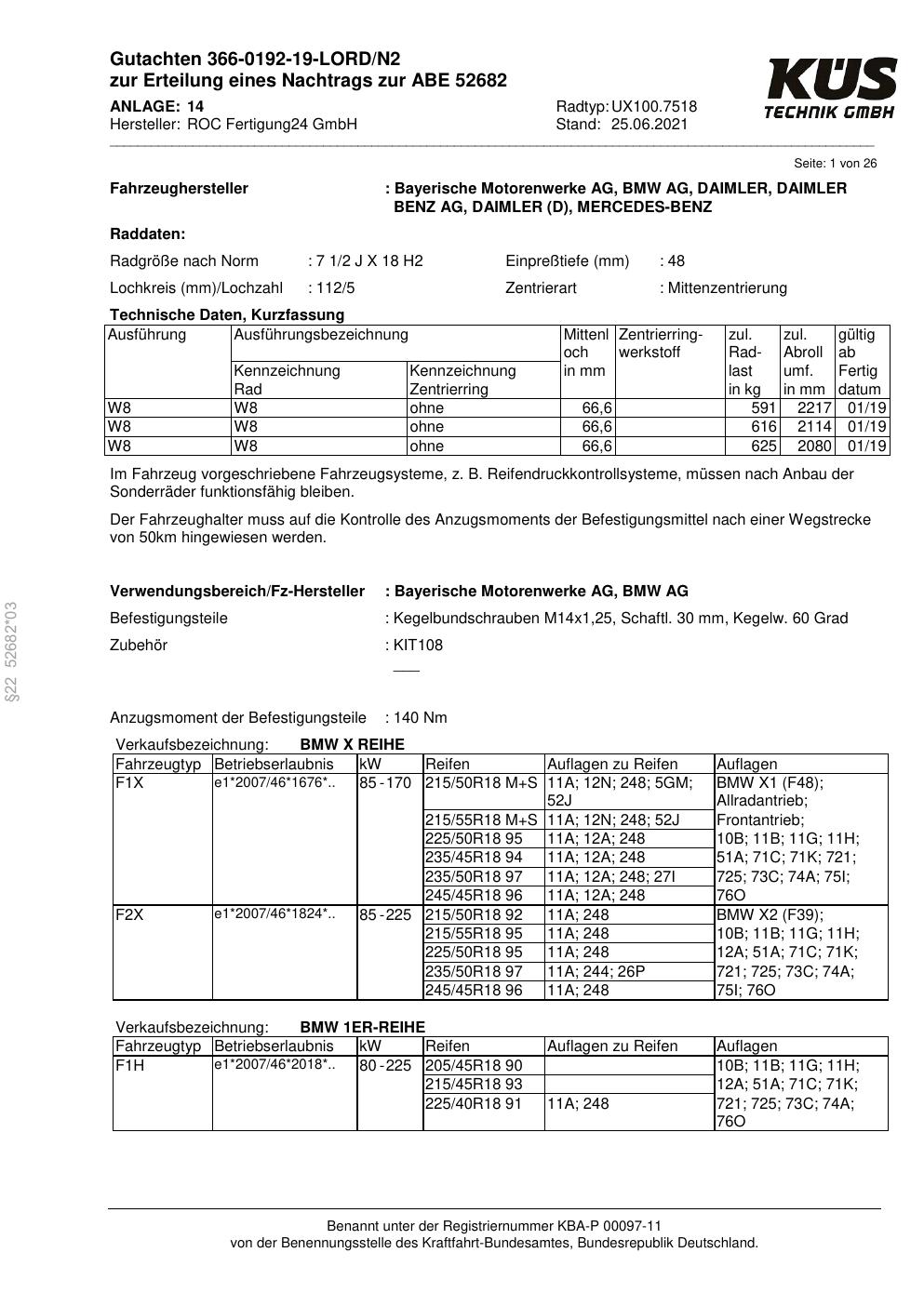 Dieses Gutachten (ABE) bezieht sich auf die Alufelge Proline UX100.7518 in der Ausführung 7.5Jx18 ET 0, Mittenloch 0 mm (KBA 52682). Im PDF findest du typischerweise zulässige Reifengrößen, Auflagen/Anbauhinweise und – je nach Dokument – Hinweise zur Eintragung.