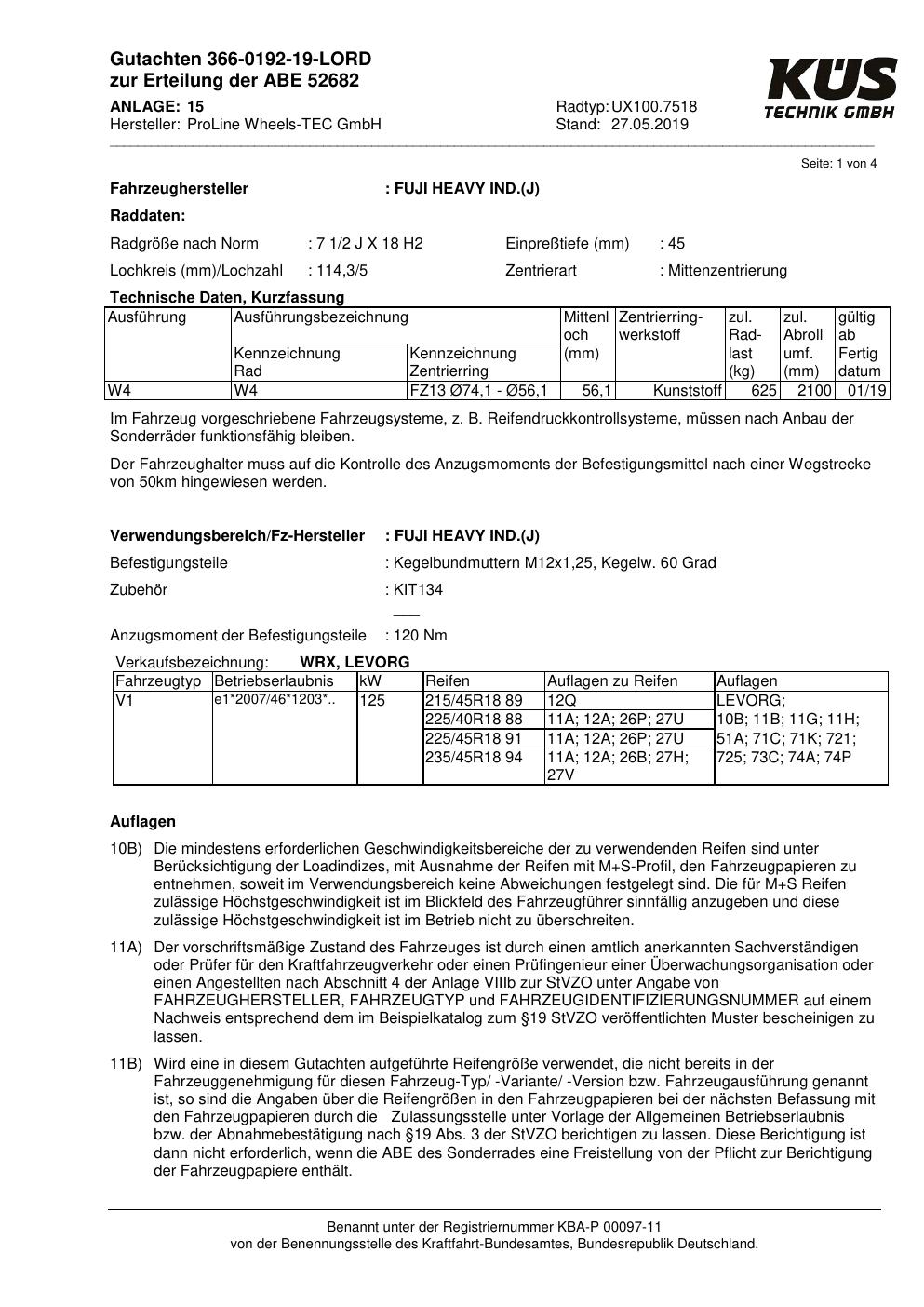 Dieses Gutachten (ABE) bezieht sich auf die Alufelge Proline UX100.7518 in der Ausführung 7.5Jx18 ET 0, Mittenloch 0 mm (KBA 52682). Im PDF findest du typischerweise zulässige Reifengrößen, Auflagen/Anbauhinweise und – je nach Dokument – Hinweise zur Eintragung.