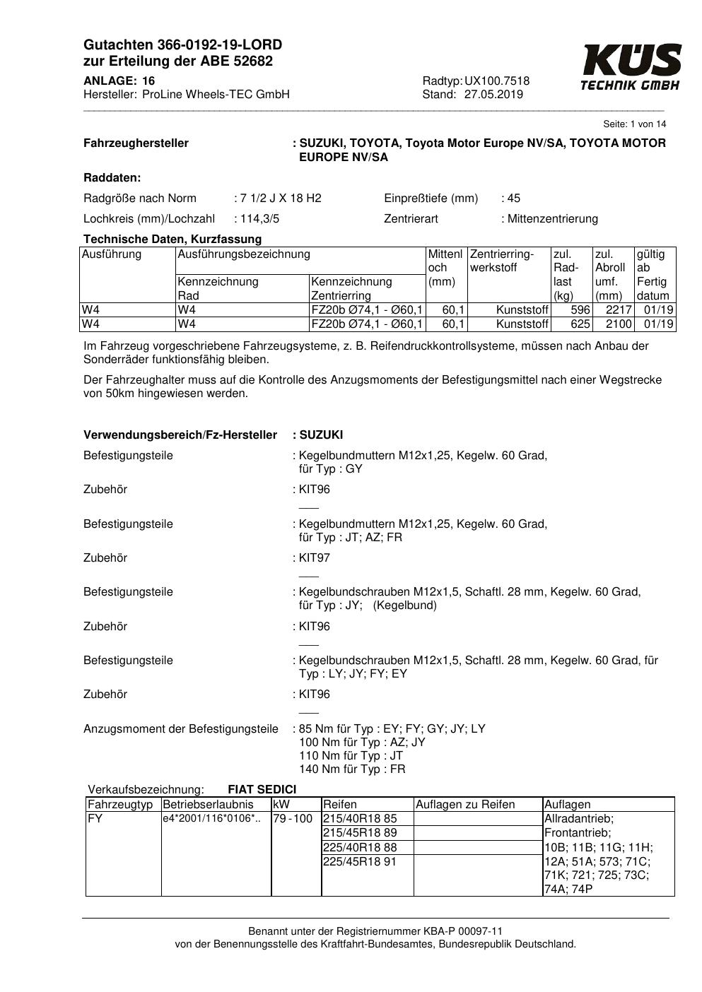 Dieses Gutachten (ABE) bezieht sich auf die Alufelge Proline UX100.7518 in der Ausführung 7.5Jx18 ET 0, Mittenloch 0 mm (KBA 52682). Im PDF findest du typischerweise zulässige Reifengrößen, Auflagen/Anbauhinweise und – je nach Dokument – Hinweise zur Eintragung.