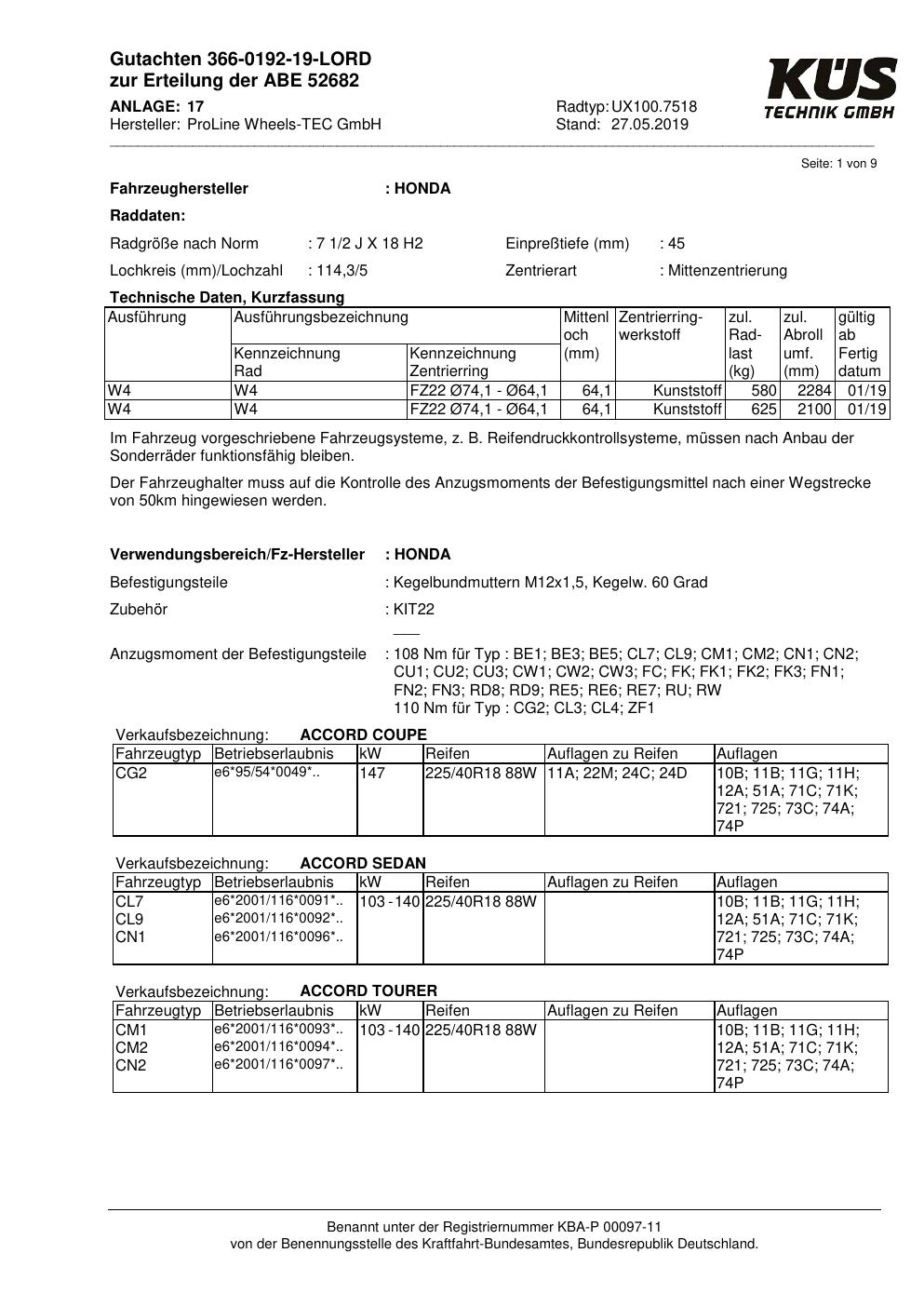 Dieses Gutachten (ABE) bezieht sich auf die Alufelge Proline UX100.7518 in der Ausführung 7.5Jx18 ET 0, Mittenloch 0 mm (KBA 52682). Im PDF findest du typischerweise zulässige Reifengrößen, Auflagen/Anbauhinweise und – je nach Dokument – Hinweise zur Eintragung.