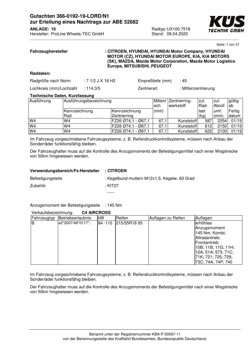Dieses Gutachten (ABE) bezieht sich auf die Alufelge Proline UX100.7518 in der Ausführung 7.5Jx18 ET 0, Mittenloch 0 mm (KBA 52682). Im PDF findest du typischerweise zulässige Reifengrößen, Auflagen/Anbauhinweise und – je nach Dokument – Hinweise zur Eintragung.
