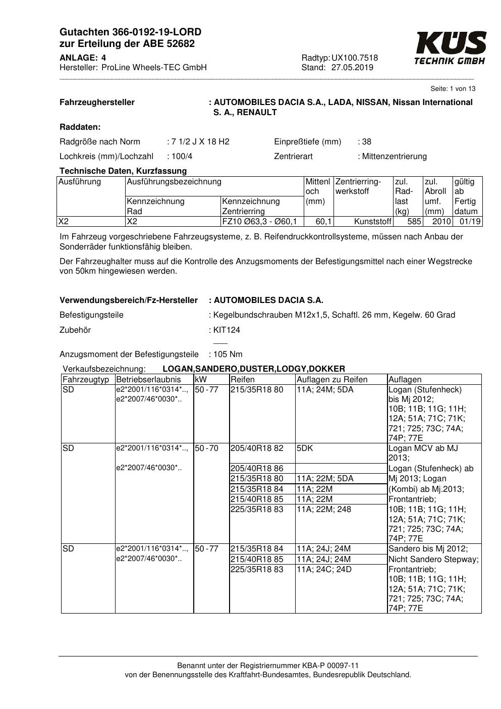 Dieses Gutachten (ABE) bezieht sich auf die Alufelge Proline UX100.7518 in der Ausführung 7.5Jx18 ET 0, Mittenloch 0 mm (KBA 52682). Im PDF findest du typischerweise zulässige Reifengrößen, Auflagen/Anbauhinweise und – je nach Dokument – Hinweise zur Eintragung.