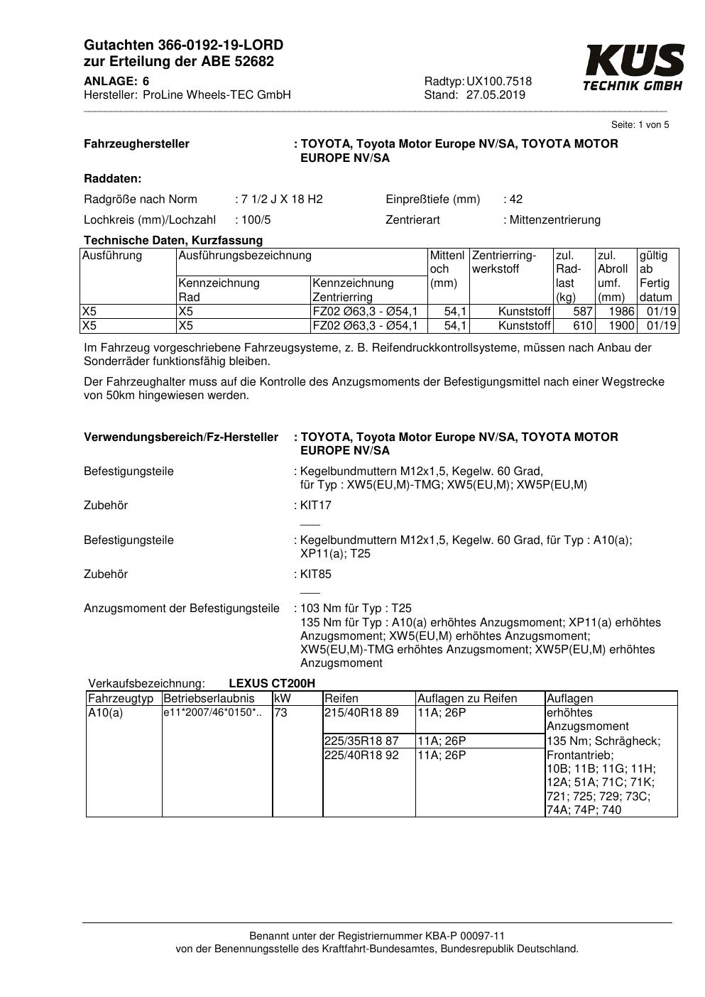 Felgengutachten / ABE für Alufelgen Proline UX100.7518 (7.5Jx18 ET 0, Mittenloch 0 mm) mit KBA 52682 (Zertifikatsnummer KBA 52682). Hier kostenlos als PDF herunterladen. Der Download-Link ist 24 Stunden gültig und kann bis zu zwei Mal verwendet werden.
