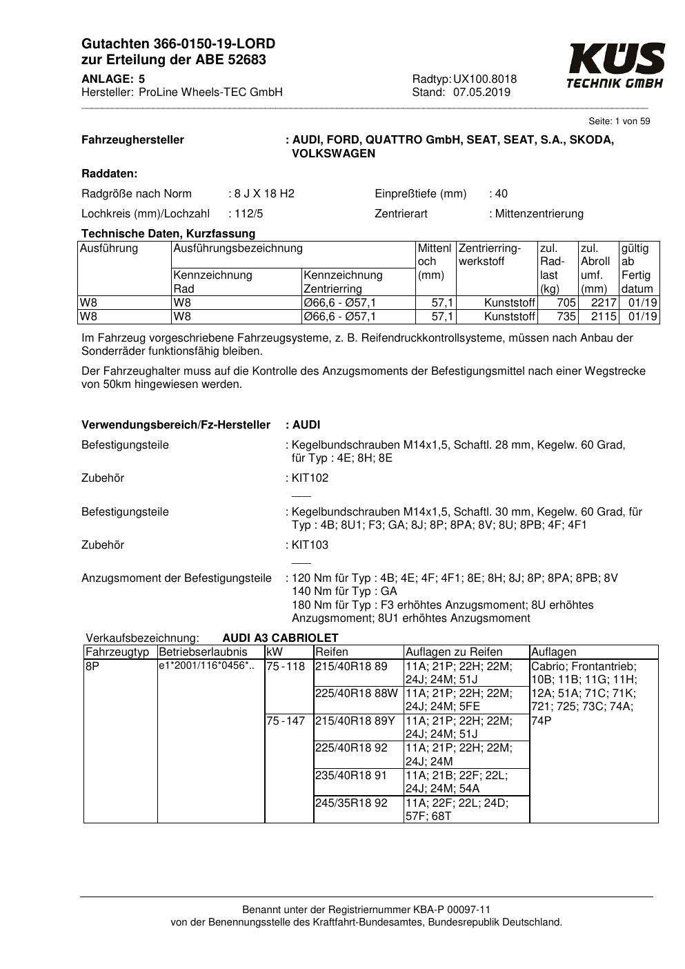 Dieses Gutachten (ABE) bezieht sich auf die Alufelge Proline UX100.8018 in der Ausführung 8Jx18 ET 0, Mittenloch 0 mm (KBA 52683). Im PDF findest du typischerweise zulässige Reifengrößen, Auflagen/Anbauhinweise und – je nach Dokument – Hinweise zur Eintragung.