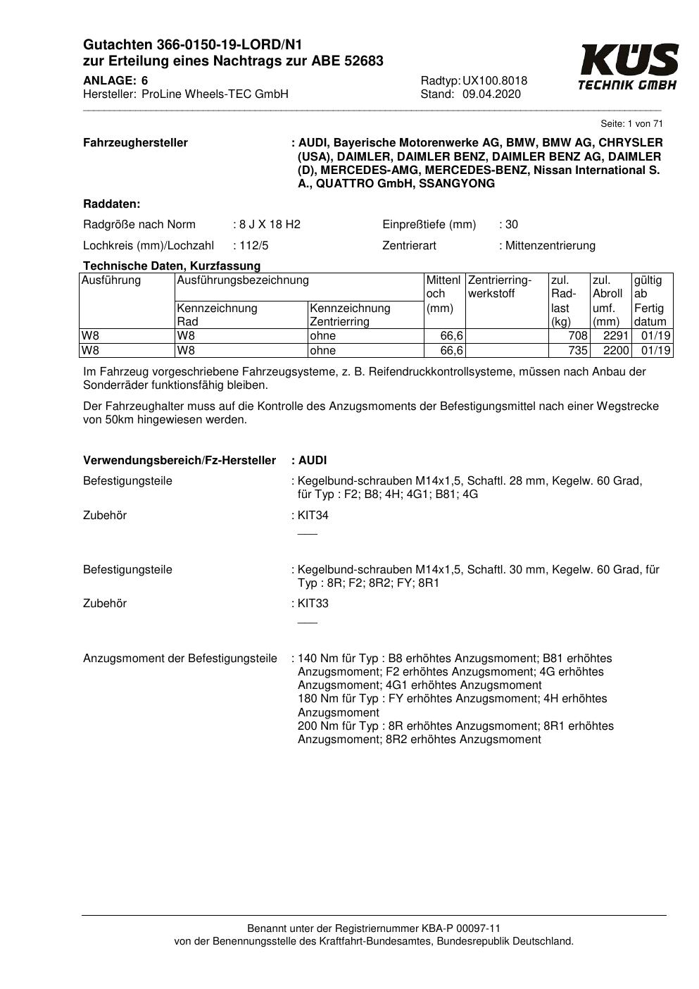 Dieses Gutachten (ABE) bezieht sich auf die Alufelge Proline UX100.8018 in der Ausführung 8Jx18 ET 0, Mittenloch 0 mm (KBA 52683). Im PDF findest du typischerweise zulässige Reifengrößen, Auflagen/Anbauhinweise und – je nach Dokument – Hinweise zur Eintragung.