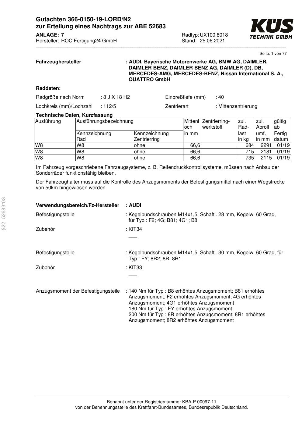 Felgengutachten / ABE für Alufelgen Proline UX100.8018 (8Jx18 ET 0, Mittenloch 0 mm) mit KBA 52683 (Zertifikatsnummer KBA 52683). Hier kostenlos als PDF herunterladen. Der Download-Link ist 24 Stunden gültig und kann bis zu zwei Mal verwendet werden.