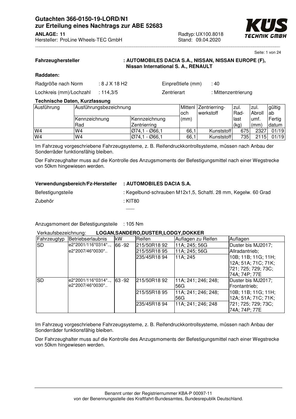 Dieses Gutachten (ABE) bezieht sich auf die Alufelge Proline UX100.8018 in der Ausführung 8Jx18 ET 0, Mittenloch 0 mm (KBA 52683). Im PDF findest du typischerweise zulässige Reifengrößen, Auflagen/Anbauhinweise und – je nach Dokument – Hinweise zur Eintragung.