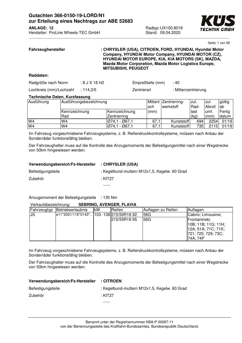 Dieses Gutachten (ABE) bezieht sich auf die Alufelge Proline UX100.8018 in der Ausführung 8Jx18 ET 0, Mittenloch 0 mm (KBA 52683). Im PDF findest du typischerweise zulässige Reifengrößen, Auflagen/Anbauhinweise und – je nach Dokument – Hinweise zur Eintragung.