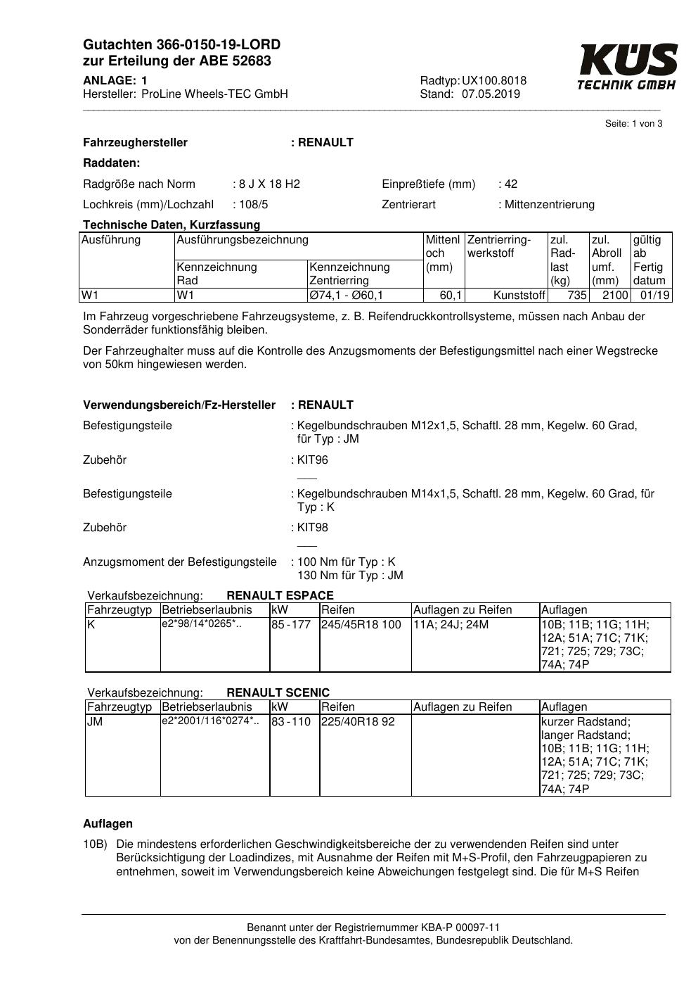 Dieses ABE gehört zur Felge Proline UX100.8018 in 8Jx18 ET0 mit KBA 52683. Die Seite ist dafür gedacht, dass du schnell prüfen kannst, ob KBA, Design und Größe zu deiner Felge passen und danach direkt das richtige PDF lädst.