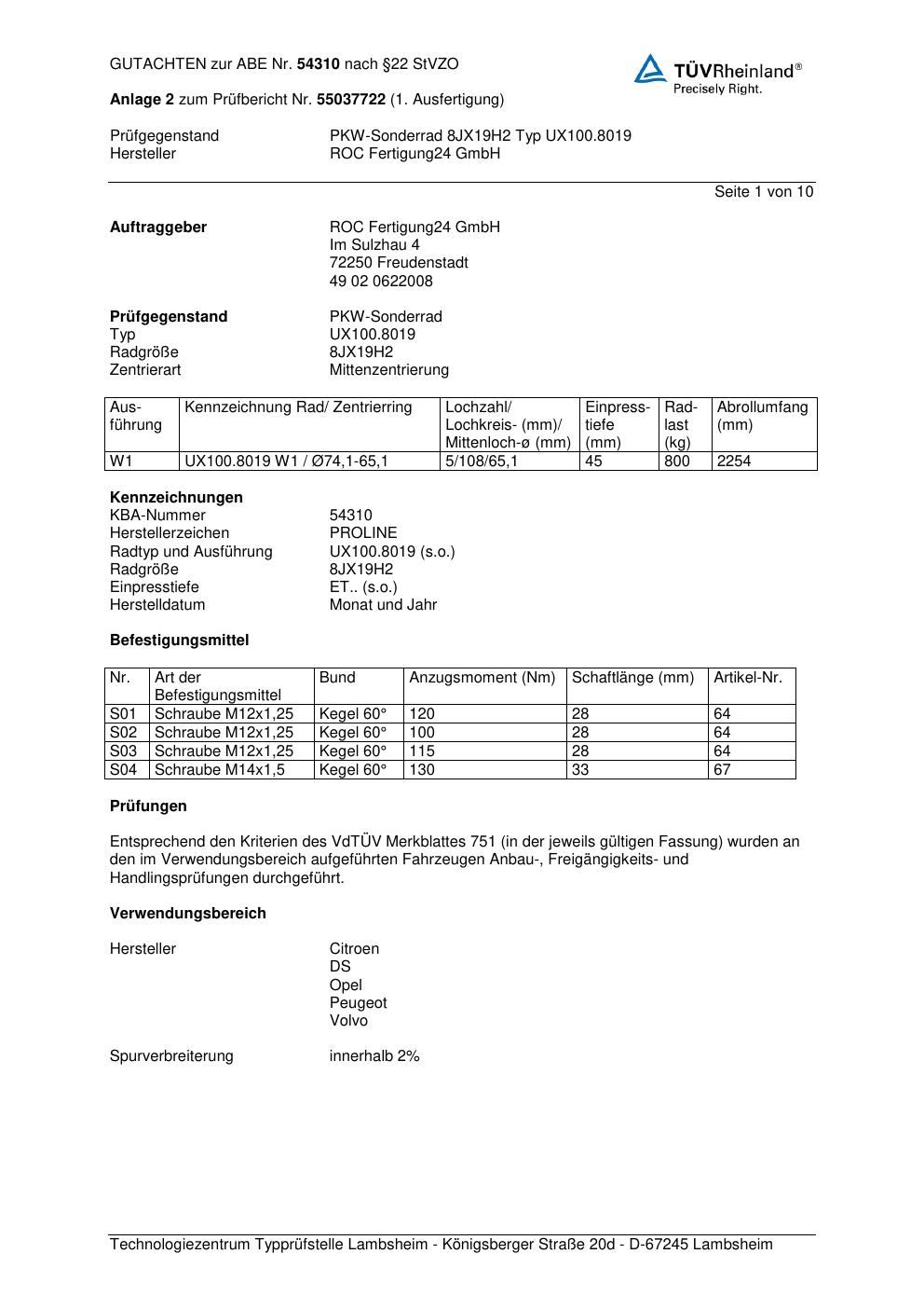 Dieses Gutachten (ABE) bezieht sich auf die Alufelge Proline UX100.8019 in der Ausführung 8Jx19 ET 0, Mittenloch 0 mm (KBA 54310). Im PDF findest du typischerweise zulässige Reifengrößen, Auflagen/Anbauhinweise und – je nach Dokument – Hinweise zur Eintragung.