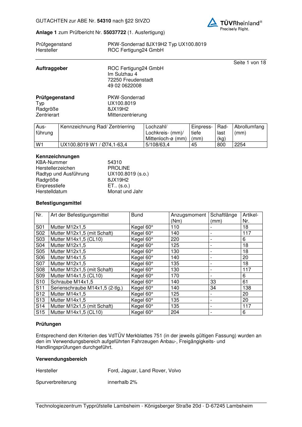 Felgengutachten / ABE für Alufelgen Proline UX100.8019 (8Jx19 ET 0, Mittenloch 0 mm) mit KBA 54310 (Zertifikatsnummer KBA 54310). Hier kostenlos als PDF herunterladen. Der Download-Link ist 24 Stunden gültig und kann bis zu zwei Mal verwendet werden.