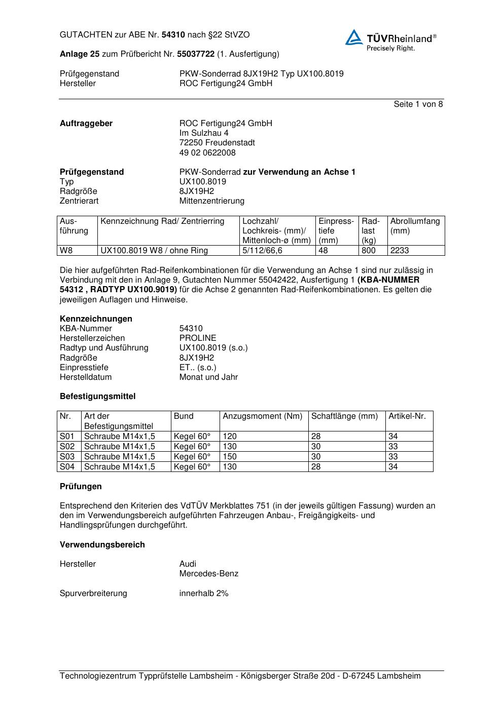 Dieses Gutachten (ABE) bezieht sich auf die Alufelge Proline UX100.8019 in der Ausführung 8Jx19 ET 0, Mittenloch 0 mm (KBA 54310). Im PDF findest du typischerweise zulässige Reifengrößen, Auflagen/Anbauhinweise und – je nach Dokument – Hinweise zur Eintragung.