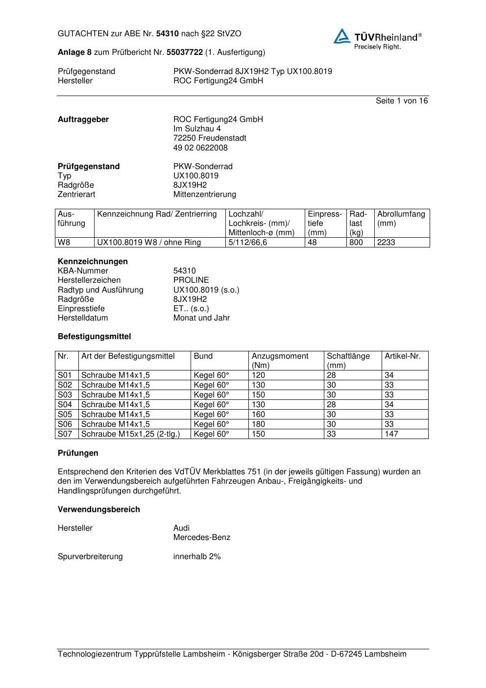 Dieses Gutachten (ABE) bezieht sich auf die Alufelge Proline UX100.8019 in der Ausführung 8Jx19 ET 0, Mittenloch 0 mm (KBA 54310). Im PDF findest du typischerweise zulässige Reifengrößen, Auflagen/Anbauhinweise und – je nach Dokument – Hinweise zur Eintragung.