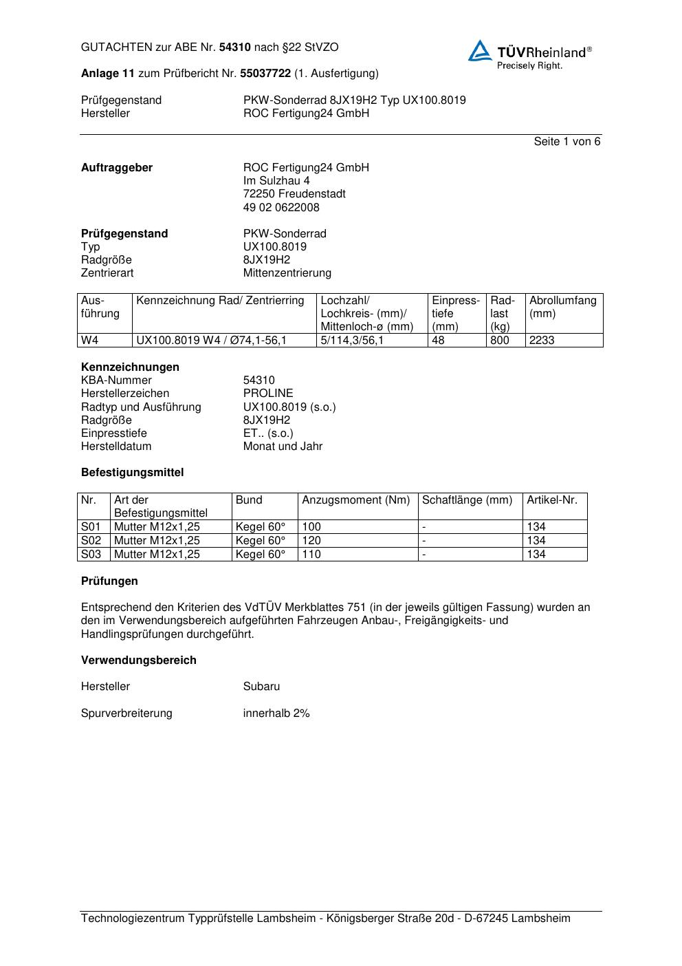 Dieses Gutachten (ABE) bezieht sich auf die Alufelge Proline UX100.8019 in der Ausführung 8Jx19 ET 0, Mittenloch 0 mm (KBA 54310). Im PDF findest du typischerweise zulässige Reifengrößen, Auflagen/Anbauhinweise und – je nach Dokument – Hinweise zur Eintragung.