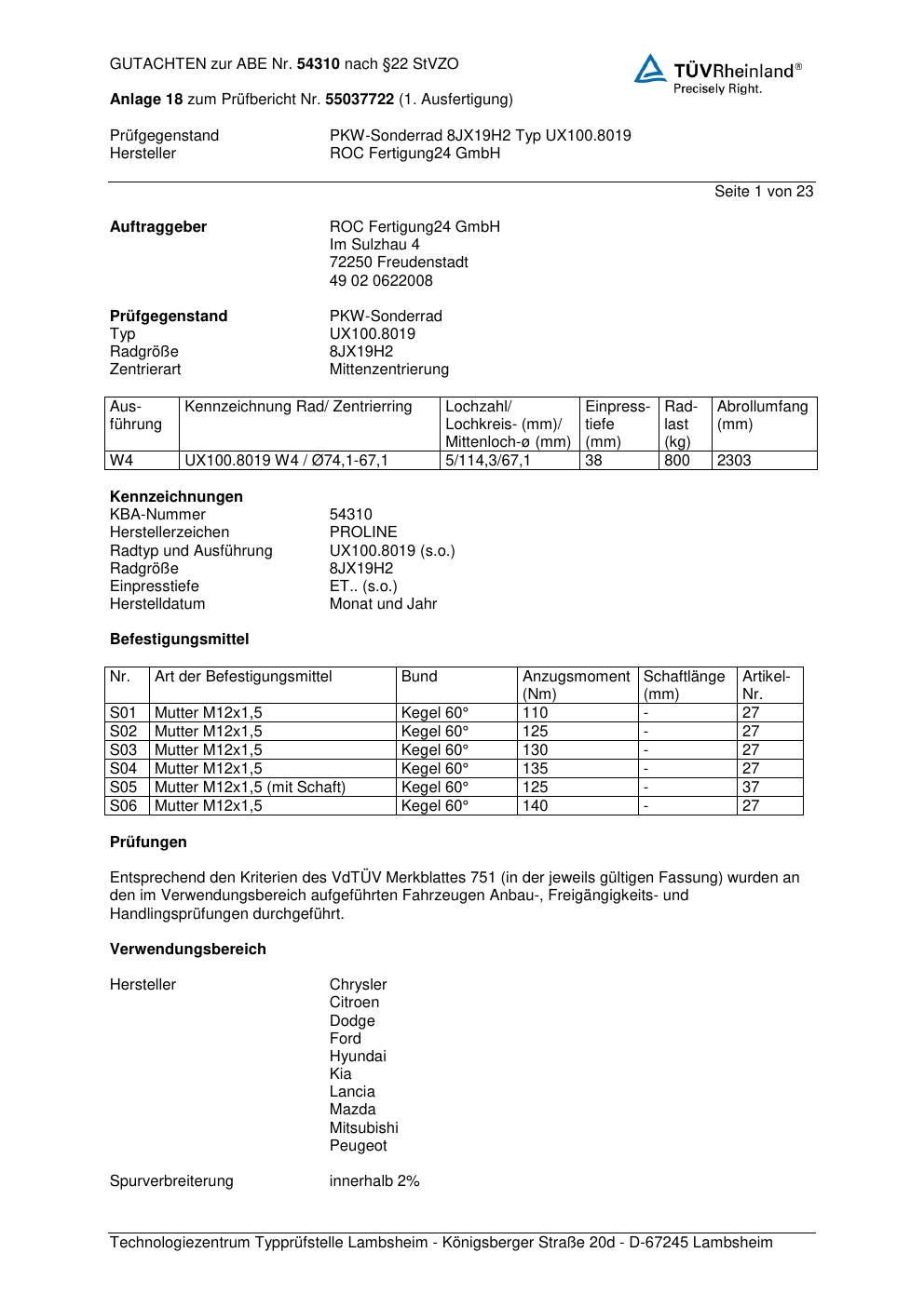 Felgengutachten / ABE für Alufelgen Proline UX100.8019 (8Jx19 ET 0, Mittenloch 0 mm) mit KBA 54310 (Zertifikatsnummer KBA 54310). Hier kostenlos als PDF herunterladen. Der Download-Link ist 24 Stunden gültig und kann bis zu zwei Mal verwendet werden.