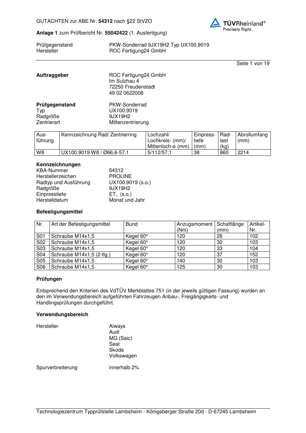 Dieses Gutachten (ABE) bezieht sich auf die Alufelge Proline UX100.9019 in der Ausführung 9Jx19 ET 0, Mittenloch 0 mm (KBA 54312). Im PDF findest du typischerweise zulässige Reifengrößen, Auflagen/Anbauhinweise und – je nach Dokument – Hinweise zur Eintragung.