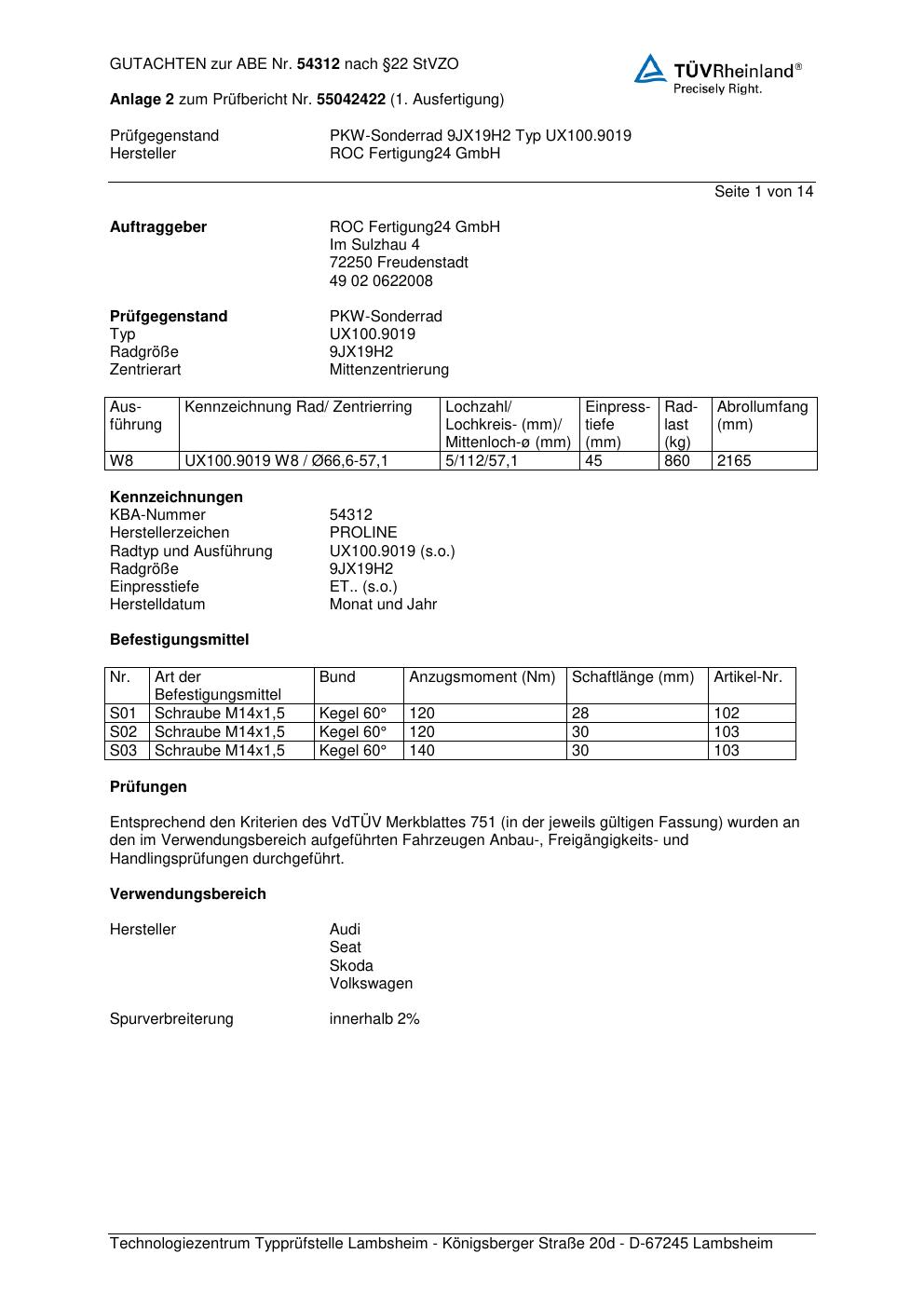 Dieses Gutachten (ABE) bezieht sich auf die Alufelge Proline UX100.9019 in der Ausführung 9Jx19 ET 0, Mittenloch 0 mm (KBA 54312). Im PDF findest du typischerweise zulässige Reifengrößen, Auflagen/Anbauhinweise und – je nach Dokument – Hinweise zur Eintragung.