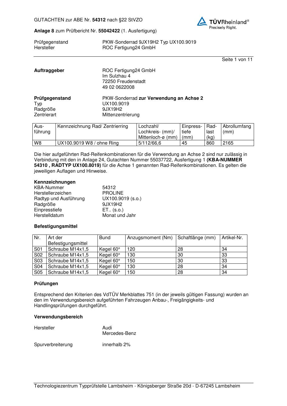 Dieses Gutachten (ABE) bezieht sich auf die Alufelge Proline UX100.9019 in der Ausführung 9Jx19 ET 0, Mittenloch 0 mm (KBA 54312). Im PDF findest du typischerweise zulässige Reifengrößen, Auflagen/Anbauhinweise und – je nach Dokument – Hinweise zur Eintragung.