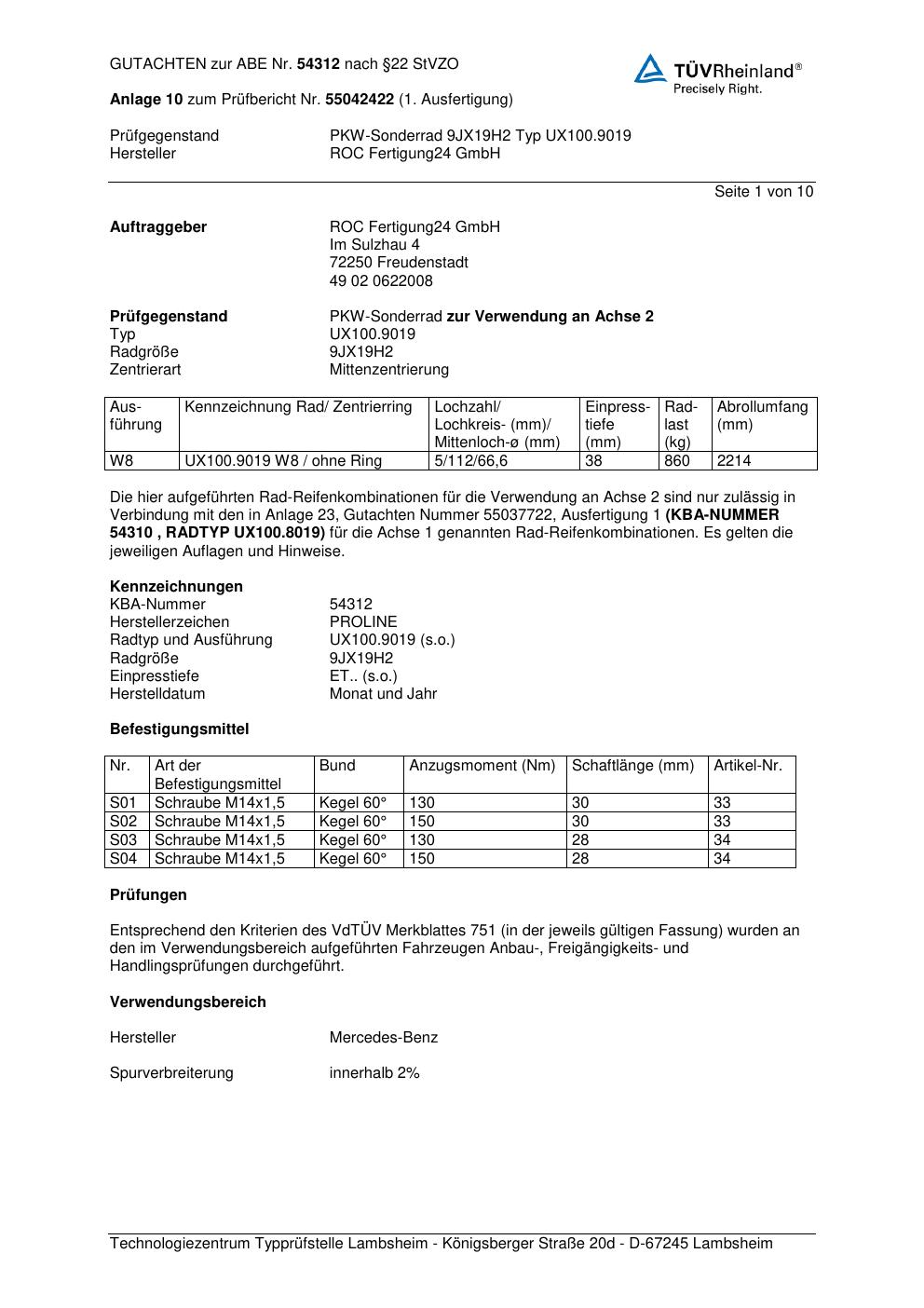 Dieses Gutachten (ABE) bezieht sich auf die Alufelge Proline UX100.9019 in der Ausführung 9Jx19 ET 0, Mittenloch 0 mm (KBA 54312). Im PDF findest du typischerweise zulässige Reifengrößen, Auflagen/Anbauhinweise und – je nach Dokument – Hinweise zur Eintragung.