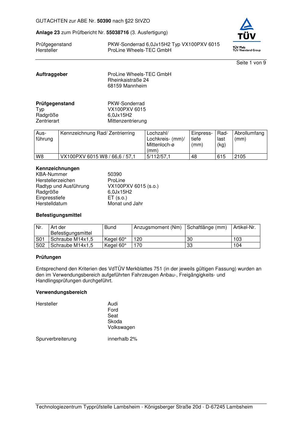 Dieses Gutachten (ABE) bezieht sich auf die Alufelge Proline VX100.6015 in der Ausführung 6Jx15 ET 0, Mittenloch 0 mm (KBA 50390). Im PDF findest du typischerweise zulässige Reifengrößen, Auflagen/Anbauhinweise und – je nach Dokument – Hinweise zur Eintragung.