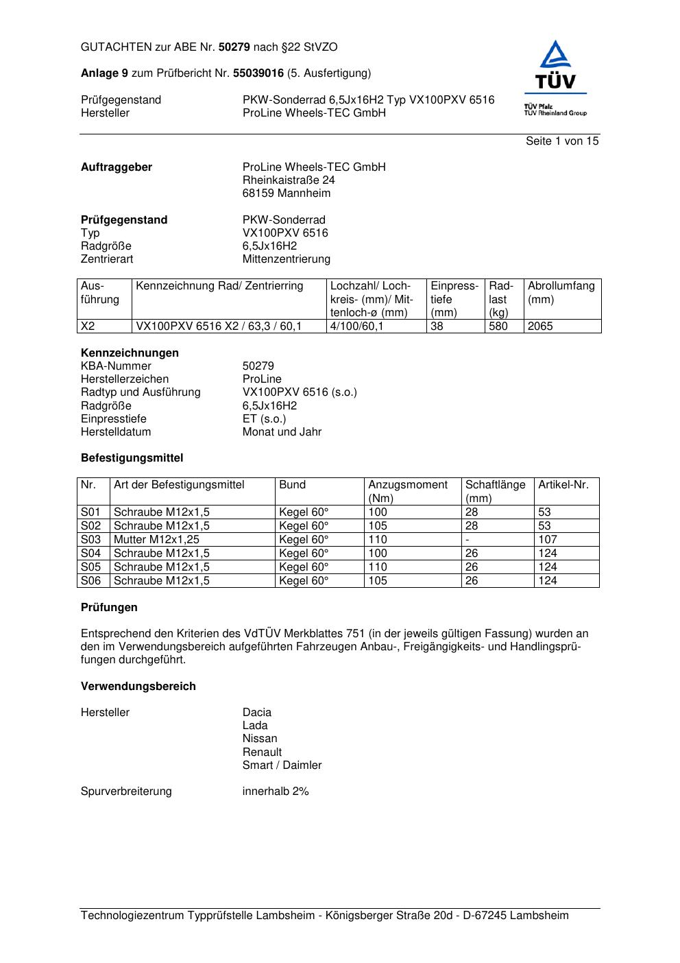 Dieses Gutachten (ABE) bezieht sich auf die Alufelge Proline VX100 in der Ausführung 6.5Jx16 ET 0, Mittenloch 0 mm (KBA 50279). Im PDF findest du typischerweise zulässige Reifengrößen, Auflagen/Anbauhinweise und – je nach Dokument – Hinweise zur Eintragung.