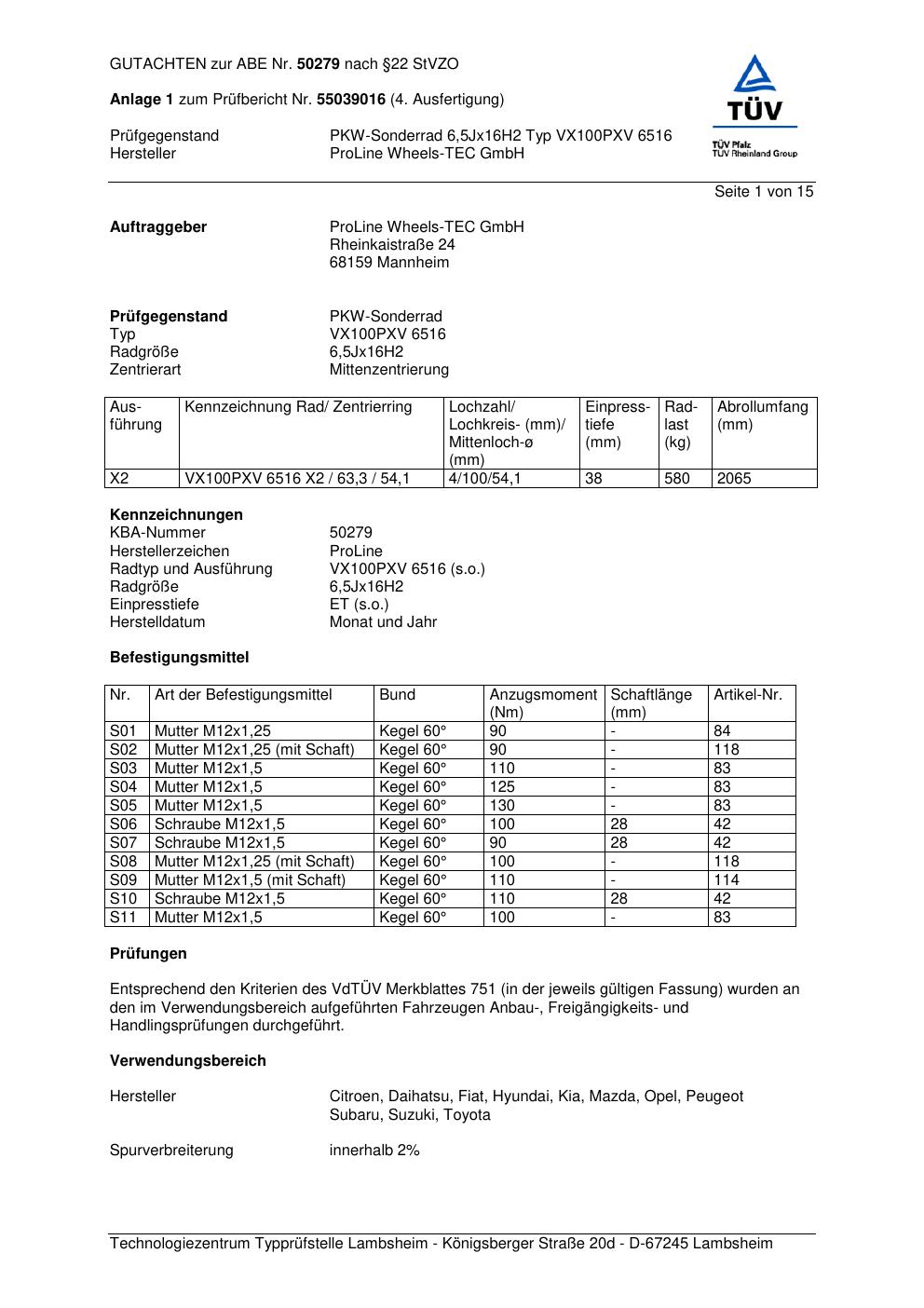 Dieses Gutachten (ABE) bezieht sich auf die Alufelge Proline VX100 in der Ausführung 6.5Jx16 ET 0, Mittenloch 0 mm (KBA 50279). Im PDF findest du typischerweise zulässige Reifengrößen, Auflagen/Anbauhinweise und – je nach Dokument – Hinweise zur Eintragung.