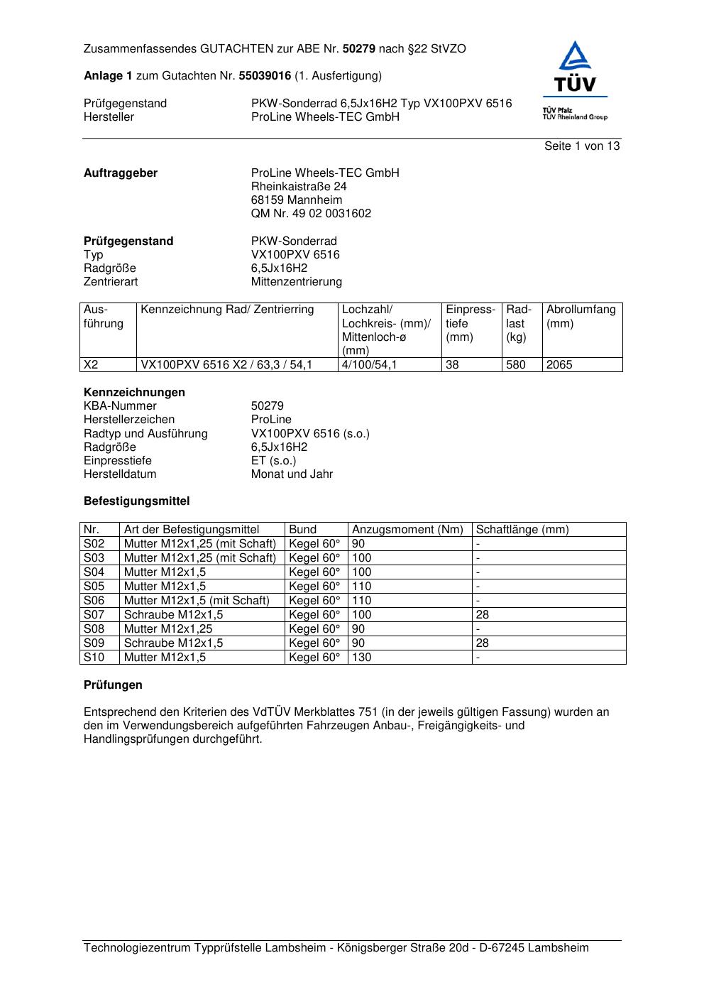 Dieses Gutachten (ABE) bezieht sich auf die Alufelge Proline VX100 in der Ausführung 6.5Jx16 ET 0, Mittenloch 0 mm (KBA 50279). Im PDF findest du typischerweise zulässige Reifengrößen, Auflagen/Anbauhinweise und – je nach Dokument – Hinweise zur Eintragung.
