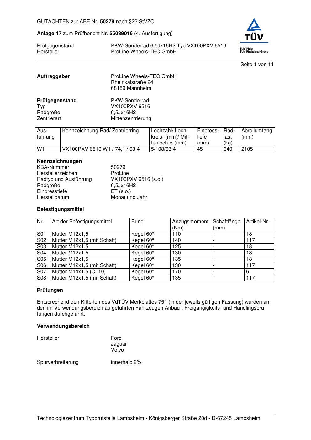 Dieses Gutachten (ABE) bezieht sich auf die Alufelge Proline VX100 in der Ausführung 6.5Jx16 ET 0, Mittenloch 0 mm (KBA 50279). Im PDF findest du typischerweise zulässige Reifengrößen, Auflagen/Anbauhinweise und – je nach Dokument – Hinweise zur Eintragung.