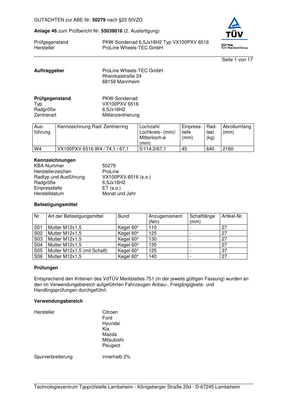 Dieses Gutachten (ABE) bezieht sich auf die Alufelge Proline VX100 in der Ausführung 6.5Jx16 ET 0, Mittenloch 0 mm (KBA 50279). Im PDF findest du typischerweise zulässige Reifengrößen, Auflagen/Anbauhinweise und – je nach Dokument – Hinweise zur Eintragung.
