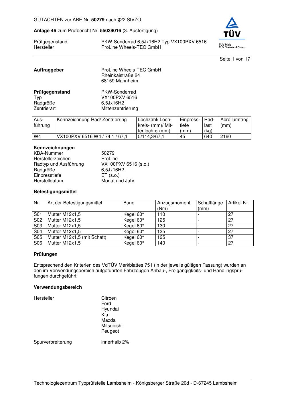Dieses Gutachten (ABE) bezieht sich auf die Alufelge Proline VX100 in der Ausführung 6.5Jx16 ET 0, Mittenloch 0 mm (KBA 50279). Im PDF findest du typischerweise zulässige Reifengrößen, Auflagen/Anbauhinweise und – je nach Dokument – Hinweise zur Eintragung.