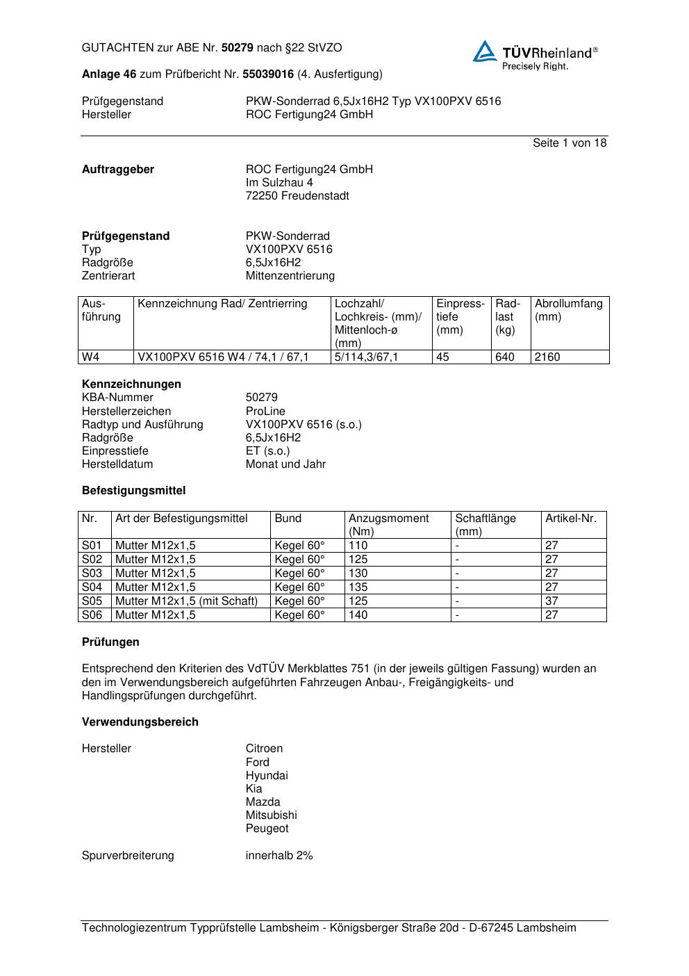 Dieses Gutachten (ABE) bezieht sich auf die Alufelge Proline VX100 in der Ausführung 6.5Jx16 ET 0, Mittenloch 0 mm (KBA 50279). Im PDF findest du typischerweise zulässige Reifengrößen, Auflagen/Anbauhinweise und – je nach Dokument – Hinweise zur Eintragung.